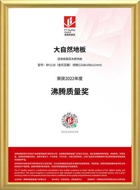 “設(shè)計(jì)看紅點(diǎn)獎(jiǎng),質(zhì)量看沸騰獎(jiǎng)”!2022年7月9日,掌握2大核心科技的大自然家居蟬聯(lián)“沸騰質(zhì)量獎(jiǎng)”,其獲獎(jiǎng)產(chǎn)品金風(fēng)玉露(型號(hào):BY1110)融合了“零醛智造”和“防水科技”,16項(xiàng)性能指標(biāo)遠(yuǎn)遠(yuǎn)優(yōu)于國(guó)家標(biāo)準(zhǔn)。這是繼去年大自然家居實(shí)木地板二翅豆(型號(hào):D1348P)獲獎(jiǎng)后,該公司再次獲得該大獎(jiǎng)。