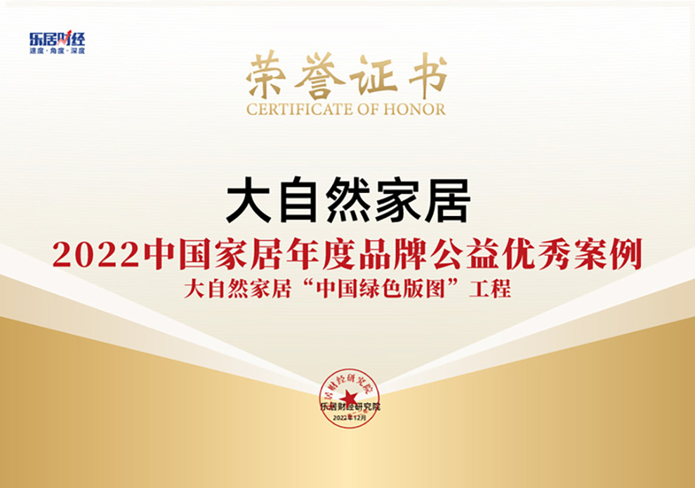 2022年12月28日,2022(第六屆)中國地產(chǎn)新時(shí)代盛典舉行。本屆活動由樂居財(cái)經(jīng)主辦,中國房地產(chǎn)業(yè)協(xié)會、全國工商聯(lián)家具裝飾業(yè)商會共同指導(dǎo),新浪財(cái)經(jīng)、中國企業(yè)家、中房網(wǎng)聯(lián)合主辦。大自然家居的“‘中國綠色版圖’工程”榮獲“2022中國家居年度品牌公益優(yōu)秀案例”。