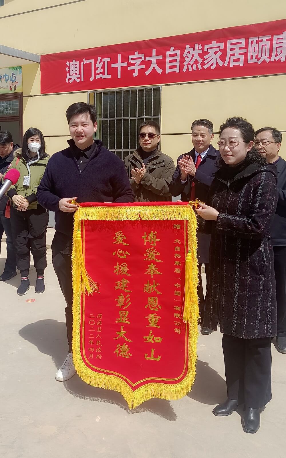 現(xiàn)場(chǎng)分別由定西市市政府代表、甘肅省紅十字會(huì)代表、澳門紅十字會(huì)代表、大自然家居董事長佘學(xué)彬以及大自然家居常務(wù)副總裁佘嘉浚共同完成揭牌儀式。