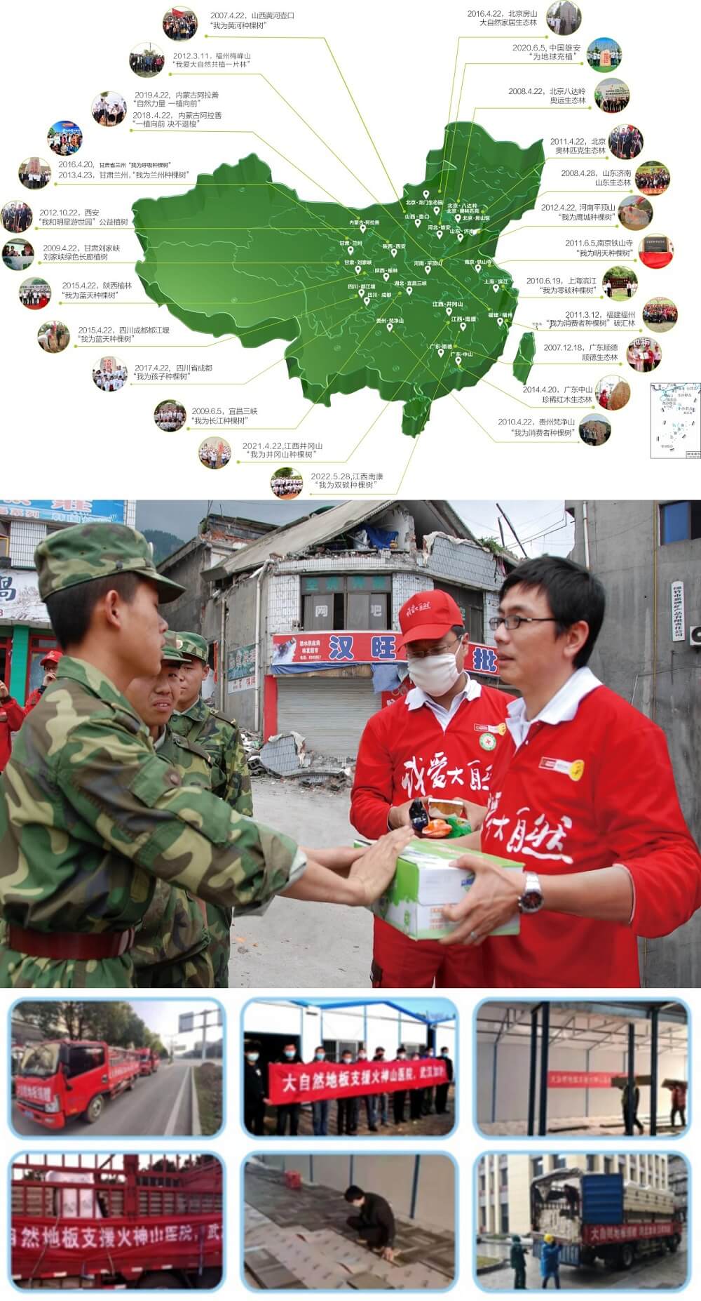 大自然家居深耕公益事業(yè)十幾年,從2006年啟動(dòng)“中國綠色版圖”工程,累計(jì)向中國綠化基金會(huì)捐資超過1500萬元,并每年開展植樹活動(dòng),截止到2022年,在國內(nèi)外共種植了27片公益生態(tài)林,植樹逾80萬棵,植樹面積超過102萬平方米。2008年,汶川地震,大自然家居率先弛援捐資救災(zāi)。2020年,新冠疫情爆發(fā),大自然家居先后向武漢火神山醫(yī)院、湖北五峰縣中醫(yī)院婦幼保健院捐資木地板超2500m2,共克時(shí)艱。