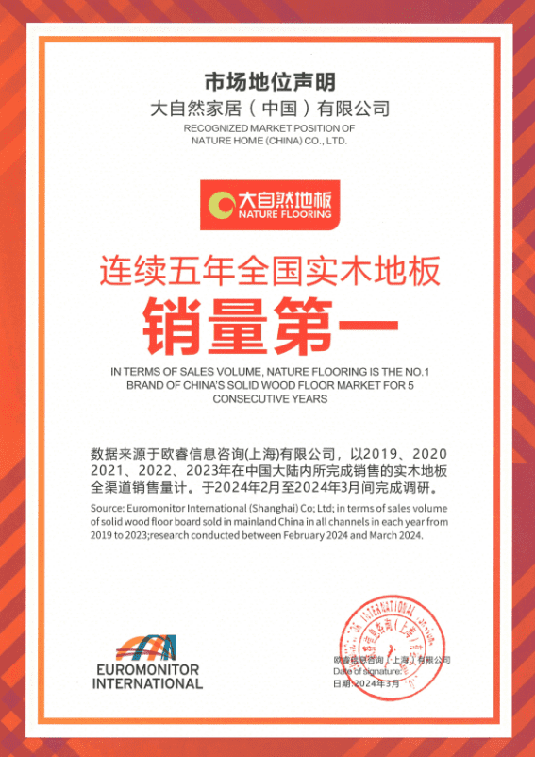 歐睿咨詢作為世界先進(jìn)的權(quán)威市場調(diào)查機(jī)構(gòu),所出示的調(diào)研數(shù)據(jù)具有行業(yè)認(rèn)可的公信力。據(jù)歐睿咨詢發(fā)布的數(shù)據(jù)顯示,大自然家居的實木地板在過去五年中一直保持著國內(nèi)市場的領(lǐng)先地位,穩(wěn)坐“全國實木地板銷量第一”寶座,展現(xiàn)出了強(qiáng)大的市場競爭力和品牌影響力。